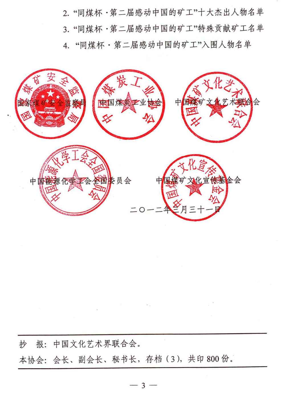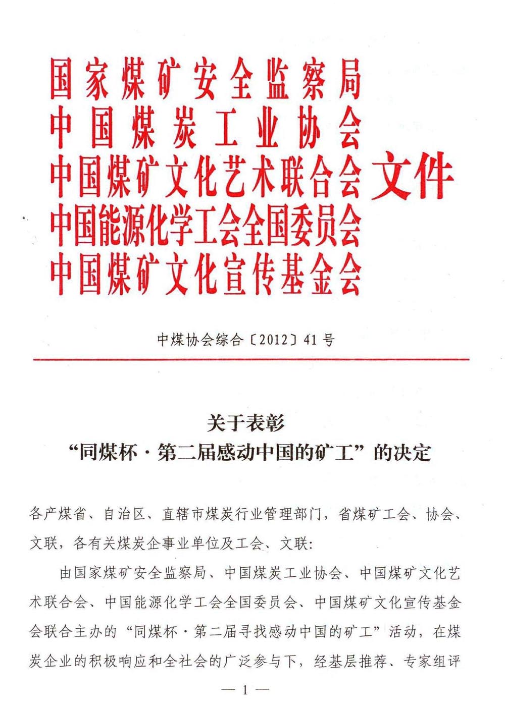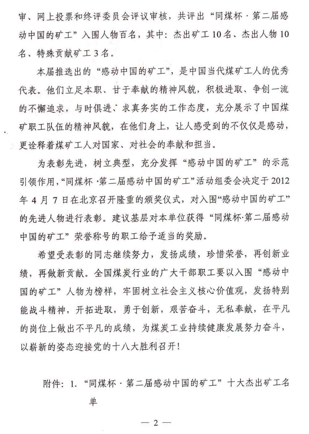 关于表彰“同煤杯第二届感动中国的矿工”的决定 来源:中国煤矿文化网 作者:煤矿文联 时间:2012-04-18 【字体:小 大】 附件: 1.同煤杯第二届感动中国的矿工十大杰出矿工名单 2.同煤杯第二届感动中国的矿工十大杰出人物名单 3.同煤杯第二届感动中国的矿工特别荣誉矿工名单 4.同煤杯第二届感动中国的矿工百名入选名单 分享到: 【打印正文】