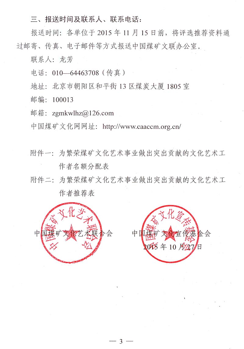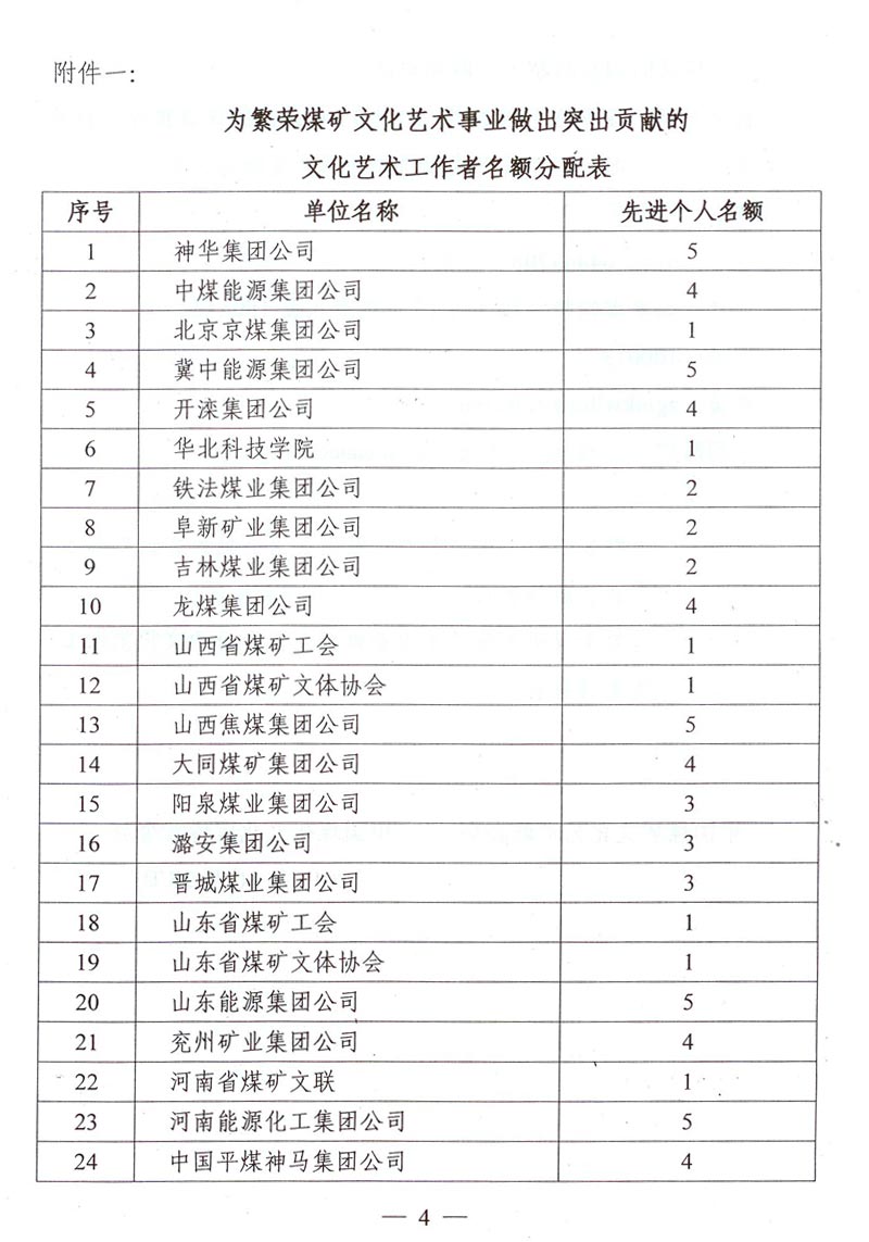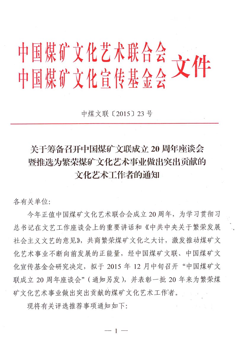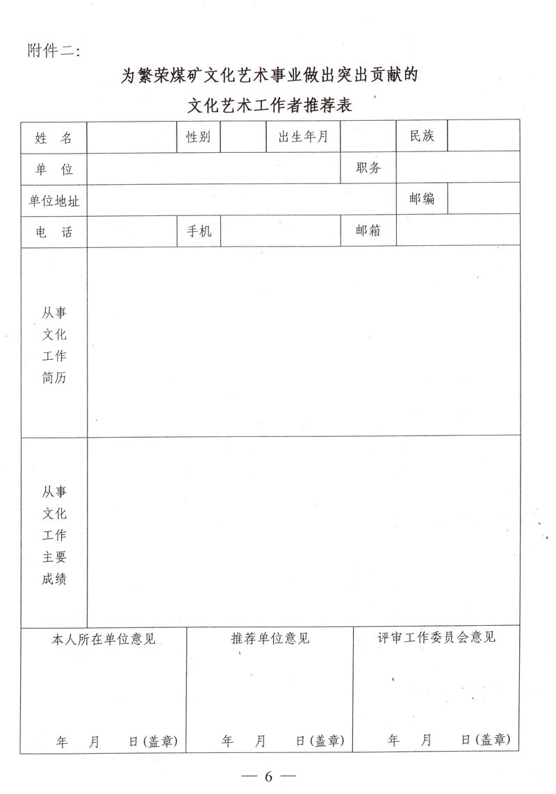 关于筹备召开中国煤矿文联成立20周年座谈会暨推选为繁荣煤矿文化艺术事业做出突出贡献的文化艺术工作者的通知 来源: 作者: 时间:2015-10-30 【字体:小 大】 附件一:为繁荣煤矿文化艺术事业做出突出贡献的文化艺术工作者名额分配表 附件二:为繁荣煤矿文化艺术事业做出突出贡献的文化艺术工作者推荐表 智能标签: 煤矿文联 工作者 相关内容 分享到: 【打印正文】