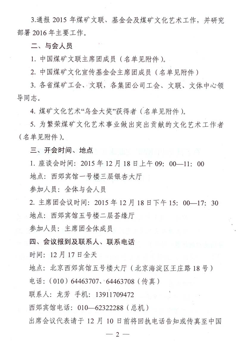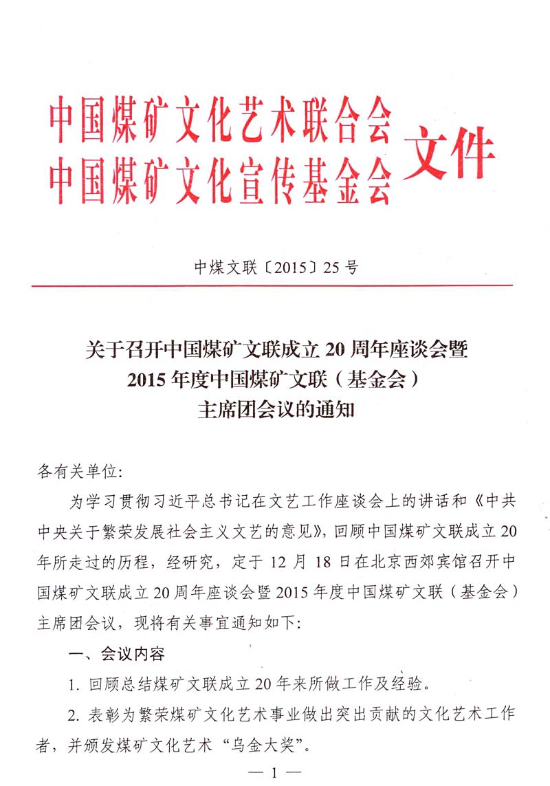关于召开中国煤矿文联成立20周年座谈会暨2015年度中国煤矿文联(基金会)主席团会议的通知 来源: 作者: 时间:2015-11-27 【字体:小 大】 附件: 一、中国煤矿文联主席团名单 二、中国煤矿文化宣传基金会主席团名单 三、煤矿文化艺术“乌金大奖”获得者名单 四、为繁荣煤矿文化艺术事业做出突出贡献的文化艺术 工作者名单 五、中国煤矿文联成立20周年座谈会回执表 六、2015年度中国煤矿文联(基金会)主席团会议回执表 智能标签: 中国煤矿文联 基金会 相关内容 分享到: 【打印正文】