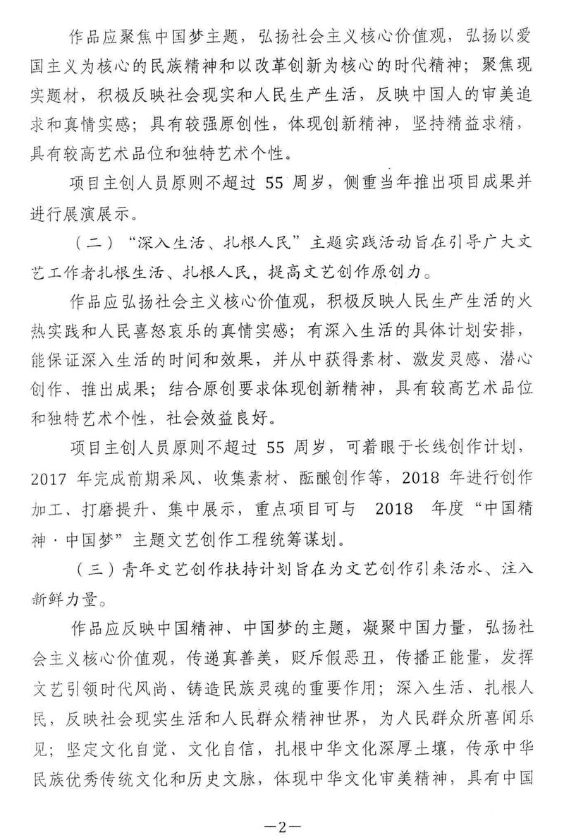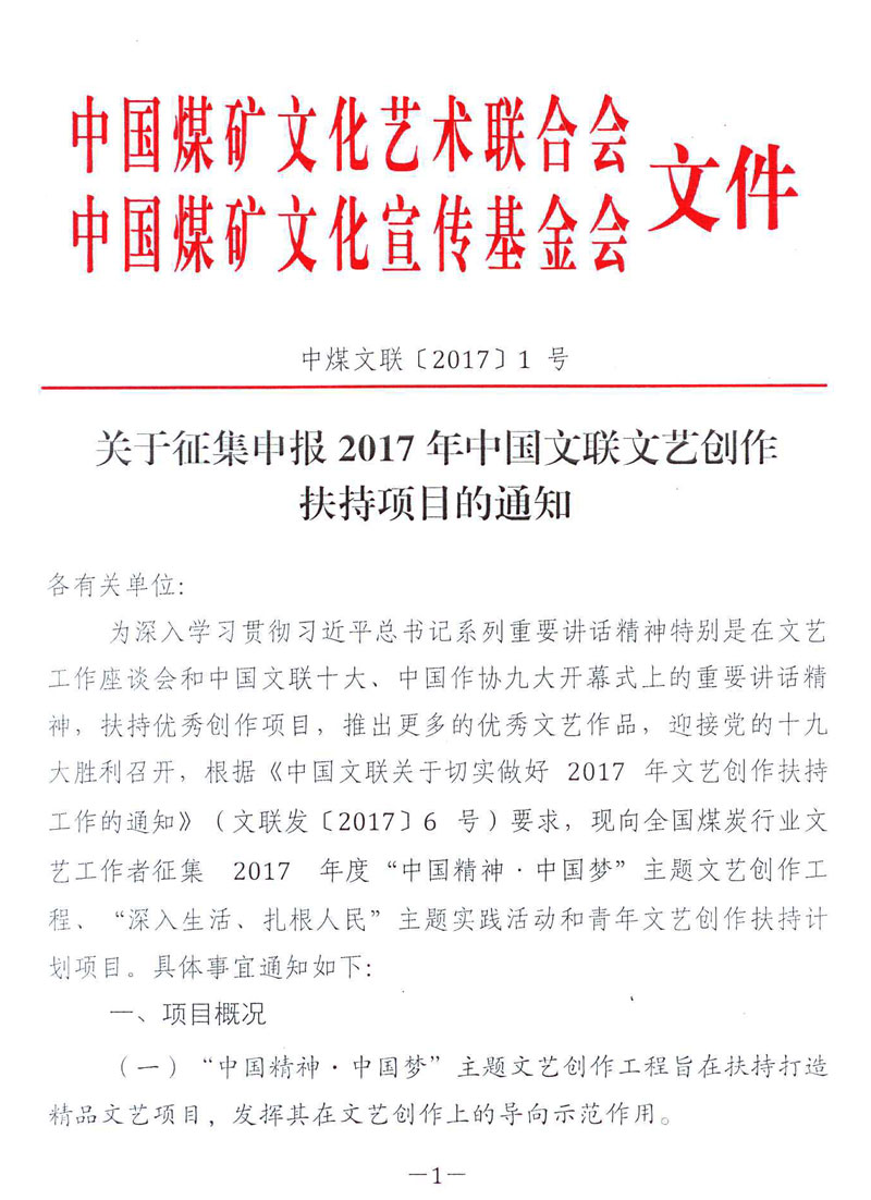 关于征集申报2017年中国文联文艺创作扶持项目的通知 来源:中国煤矿文联 作者: 时间:2017-01-20 【字体:小 大】 附件: 1.《中国文联2017年度“中国精神·中国梦”主题文艺创作工程项目专项资金申报表》 2.《中国文联2017年度“深入生活、扎根人民”主题实践活动项目专项资金申报表》 3.《中国文联2017年度青年文艺创作扶持计划项目专项资金申报表》 具体方案: 1.《中国文联2017年度“中国精神·中国梦”主题文艺创作工程总体方案》 2.《中国文联2017年度“深入生活、扎根人民”主题实践活动总体方案》 3.《中国文联2017年度青年文艺创作扶持计划总体方案》 智能标签: 中国文联 文艺 扶持 相关内容 分享到: 【打印正文】