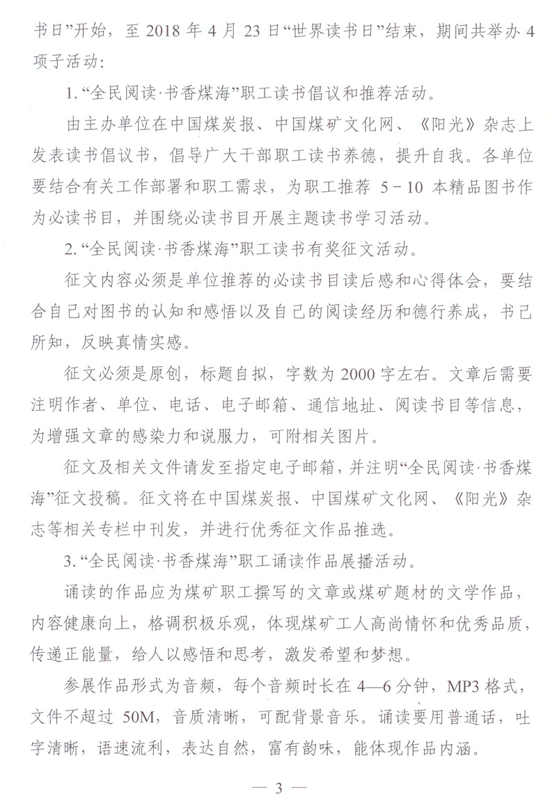 关于开展“全民阅读·书香煤海”职工读书活动的通知 来源:中国煤矿文联 作者: 时间:2017-04-21 【字体:小 大】 附件: 1. “全民阅读·书香煤海”职工诵读作品展播活动登记表 2. “书香企业”推选活动登记表 智能标签: 书香煤海 相关内容 分享到: 【打印正文】