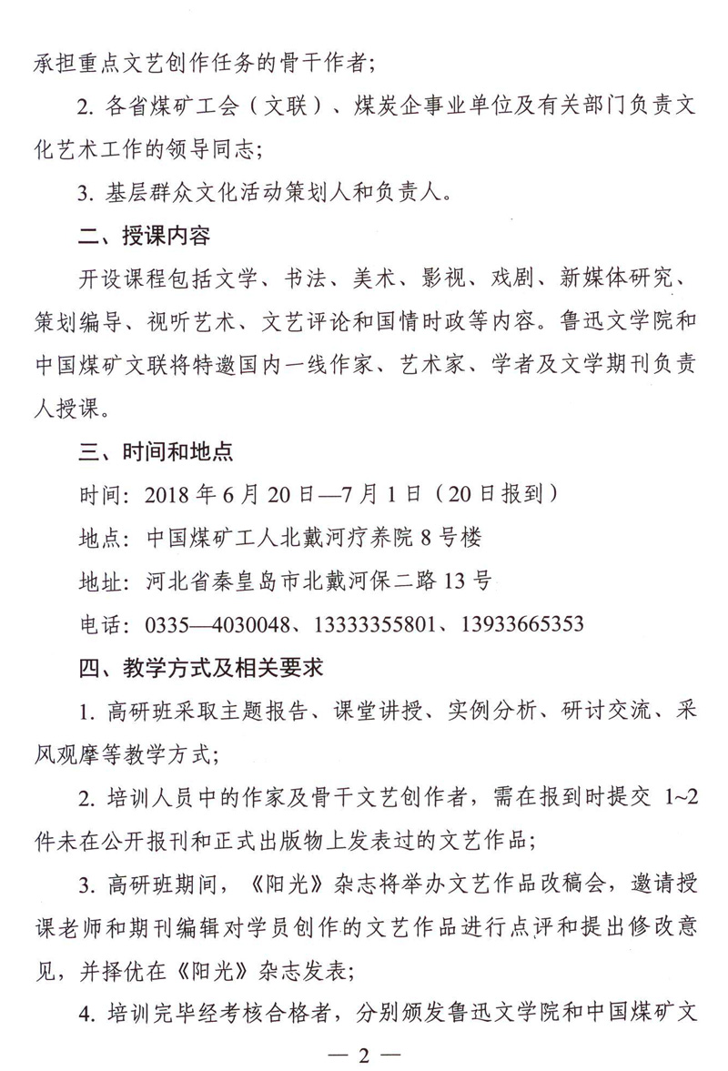 关于与鲁迅文学院合作举办首届煤矿作家高研班暨第五届煤矿文化干部高研班的通知 来源:中国煤矿文联 作者: 时间:2018-05-18 【字体:小 大】 附件:鲁迅文学院首届煤矿作家高研班暨第五届煤矿文化干部高研班报名表 智能标签: 中国煤矿文联 相关内容 分享到: 【打印正文】