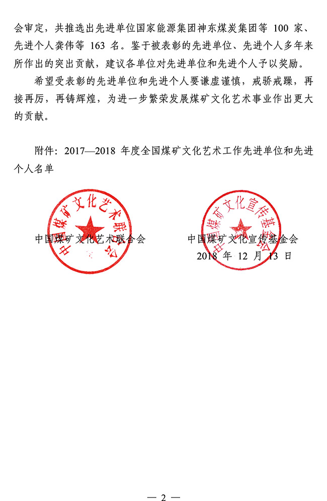 关于表彰2017—2018年度全国煤矿文化艺术工作先进单位和先进个人的决定 来源:中国煤矿文联 作者: 时间:2018-12-15 【字体:小 大】 关于表彰2017—2018年度全国煤矿文化艺术工作先进单位和先进个人的决定(PDF版) 智能标签: 中国煤矿文联 相关内容 分享到: 【打印正文】