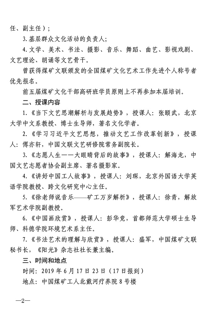 关于举办第六届煤矿文化干部高研班的通知 来源:中国煤矿文联 作者: 时间:2019-05-20 【字体:小 大】 附件:关于举办第六届煤矿文化干部高研班的通知(PDF版)第六届煤矿文化干部高研班报名表 智能标签: 中国煤矿文联 相关内容 分享到: 【打印正文】