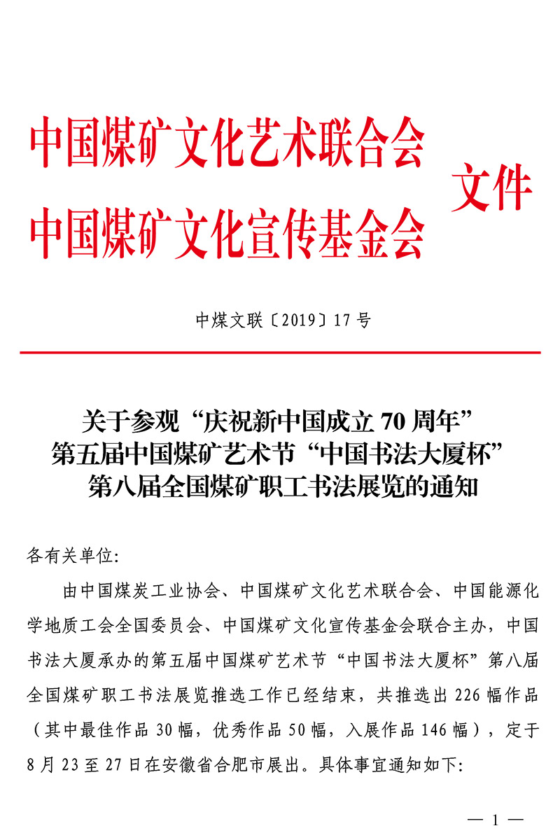 关于参观第八届全国煤矿职工书法展览的通知 来源:中国煤矿文联 作者: 时间:2019-07-26 【字体:小 大】 附件:· 关于参观“庆祝新中国成立70周年”第五届中国煤矿艺术节“中国书法大厦杯”第八届全国煤矿职工书法展览的通知(PDF版,含附件1)· 参观展览人员回执表(附件2) 智能标签: 中国煤矿文联 中国煤矿艺术节 相关内容 分享到: 【打印正文】