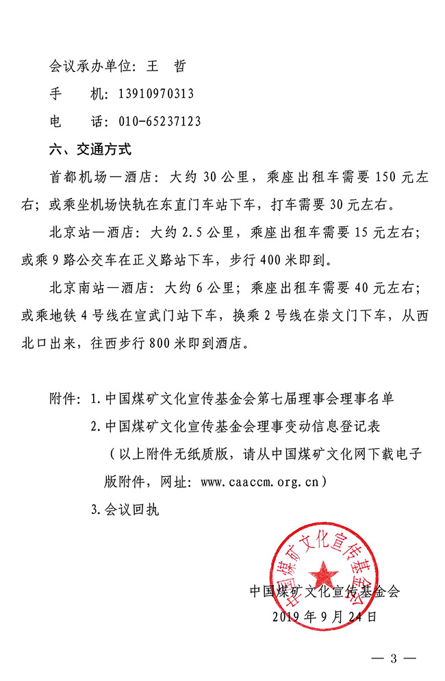 关于召开中国煤矿文化宣传基金会第七届理事会第二次会议的通知 来源:中国煤矿文化宣传基金会 作者: 时间:2019-09-30 【字体:小 大】 附件:关于召开中国煤矿文化宣传基金会第七届理事会第二次会议的通知(PDF版)1.中国煤矿文化宣传基金会第七届理事会理事名单2.中国煤矿文化宣传基金会理事变动信息登记表3.会议回执 智能标签: 中国煤矿文化宣传基金会 相关内容 分享到: 【打印正文】