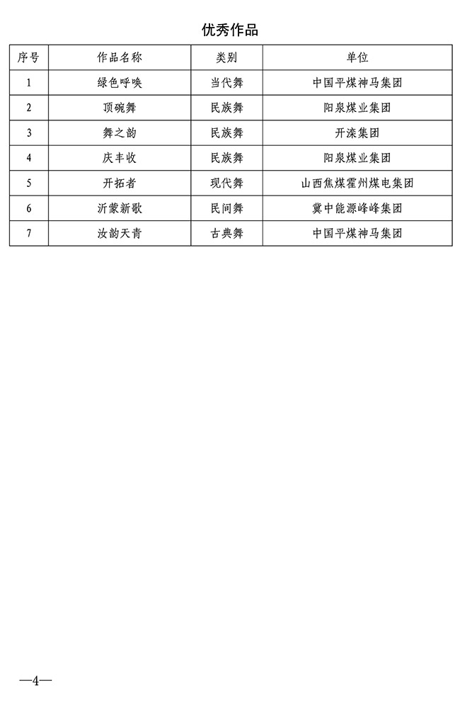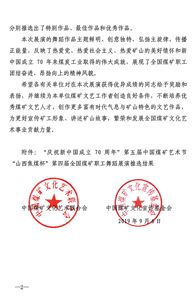 关于“庆祝新中国成立70周年”第五届中国煤矿艺术节“山西焦煤杯”第四届全国煤矿职工舞蹈展演推选结果的通知 来源:中国煤矿文联 作者: 时间:2019-10-30 【字体:小 大】 关于“庆祝新中国成立70周年”第五届中国煤矿艺术节“山西焦煤杯”第四届全国煤矿职工舞蹈展演推选结果的通知(PDF版) 智能标签: 中国煤矿文联 中国煤矿艺术节 相关内容 分享到: 【打印正文】