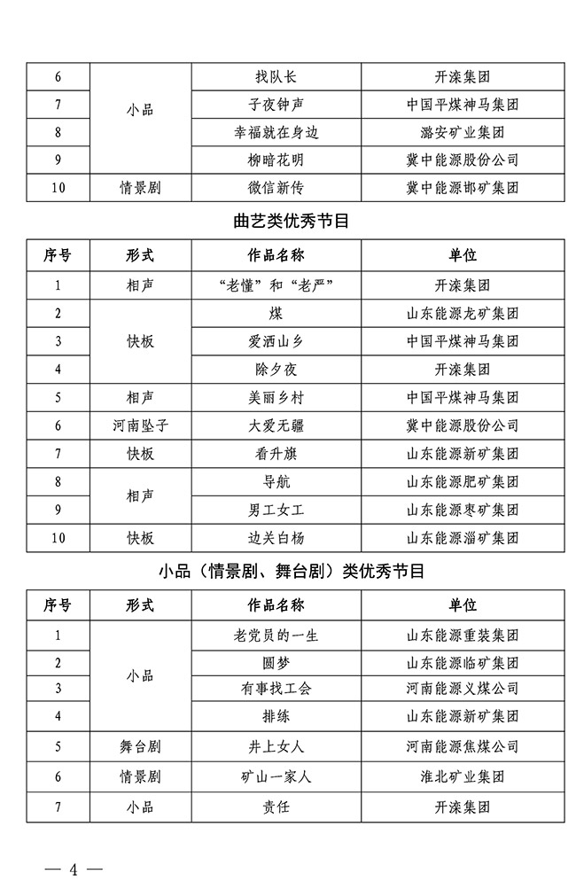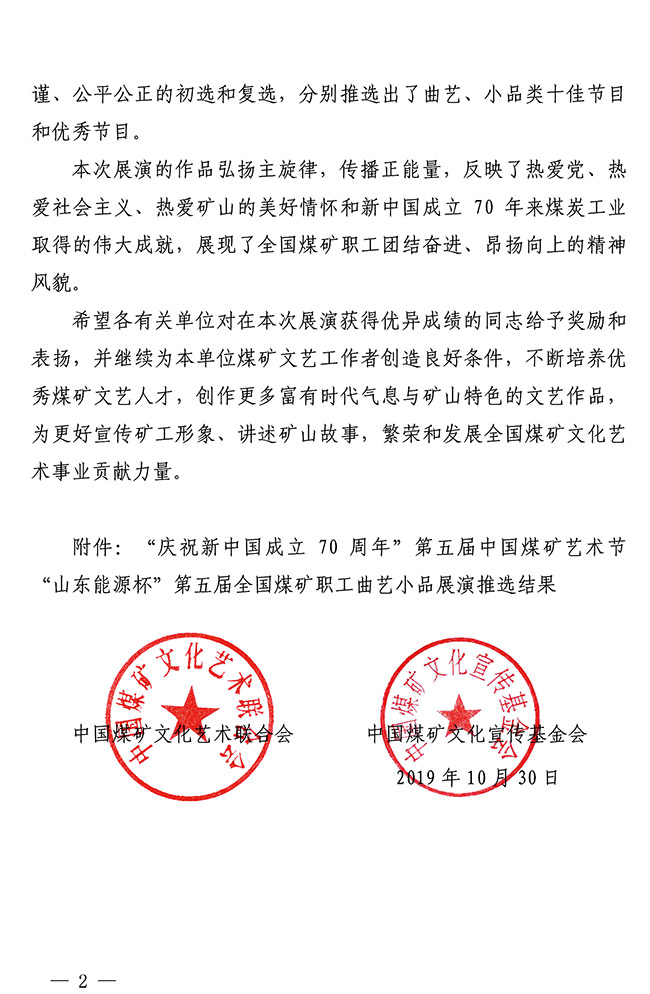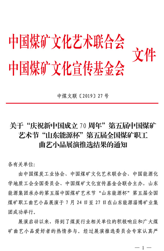 关于“庆祝新中国成立70周年”第五届中国煤矿艺术节“山东能源杯”第五届全国煤矿职工曲艺小品展演推选结果的通知 来源:中国煤矿文联 作者: 时间:2019-10-30 【字体:小 大】 关于“庆祝新中国成立70周年”第五届中国煤矿艺术节“山东能源杯”第五届全国煤矿职工曲艺小品展演推选结果的通知(PDF版) 智能标签: 中国煤矿文联 中国煤矿艺术节 相关内容 分享到: 【打印正文】