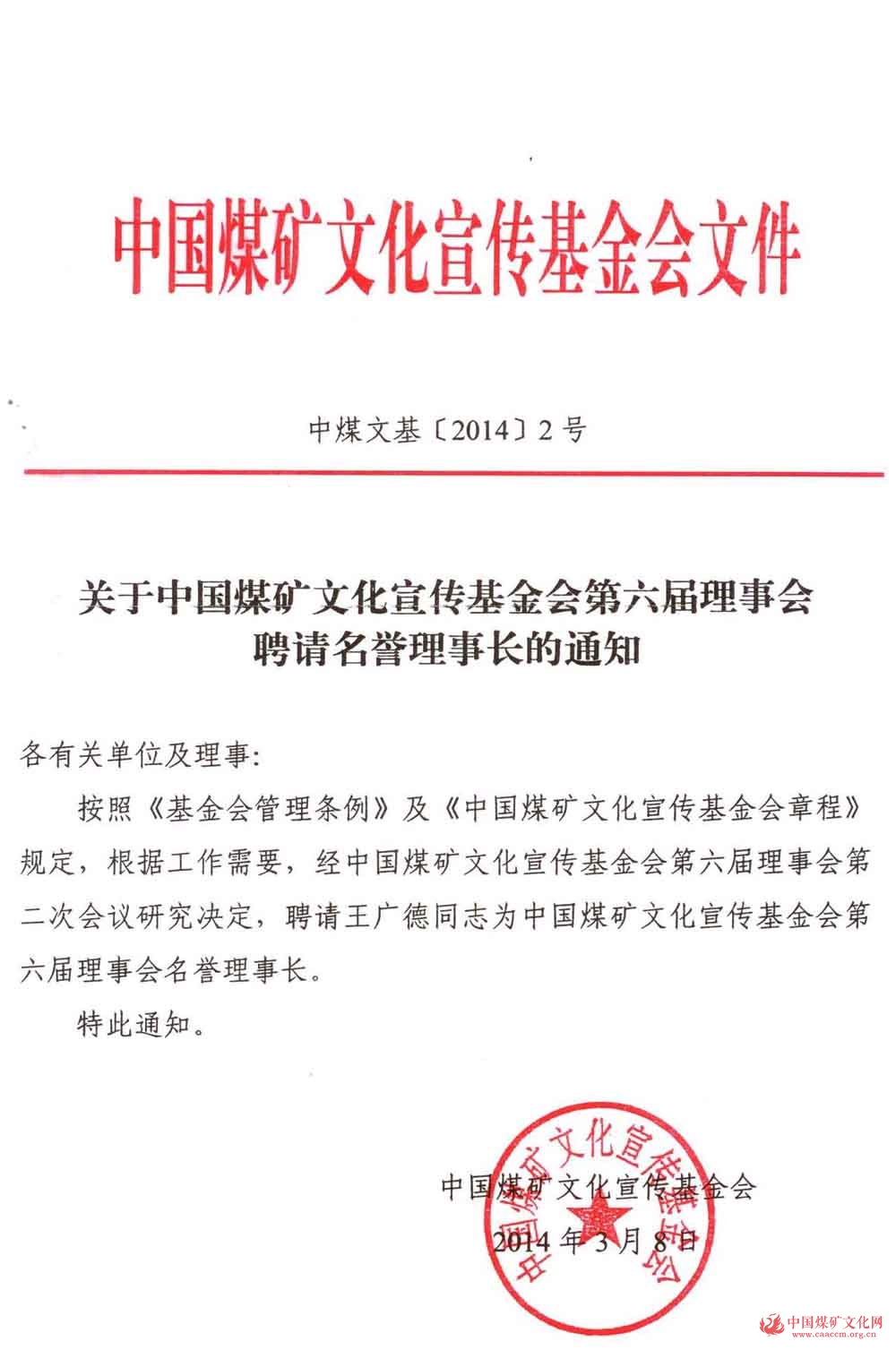 关于中国煤矿文化宣传基金会第六届理事会聘请名誉理事长的通知
