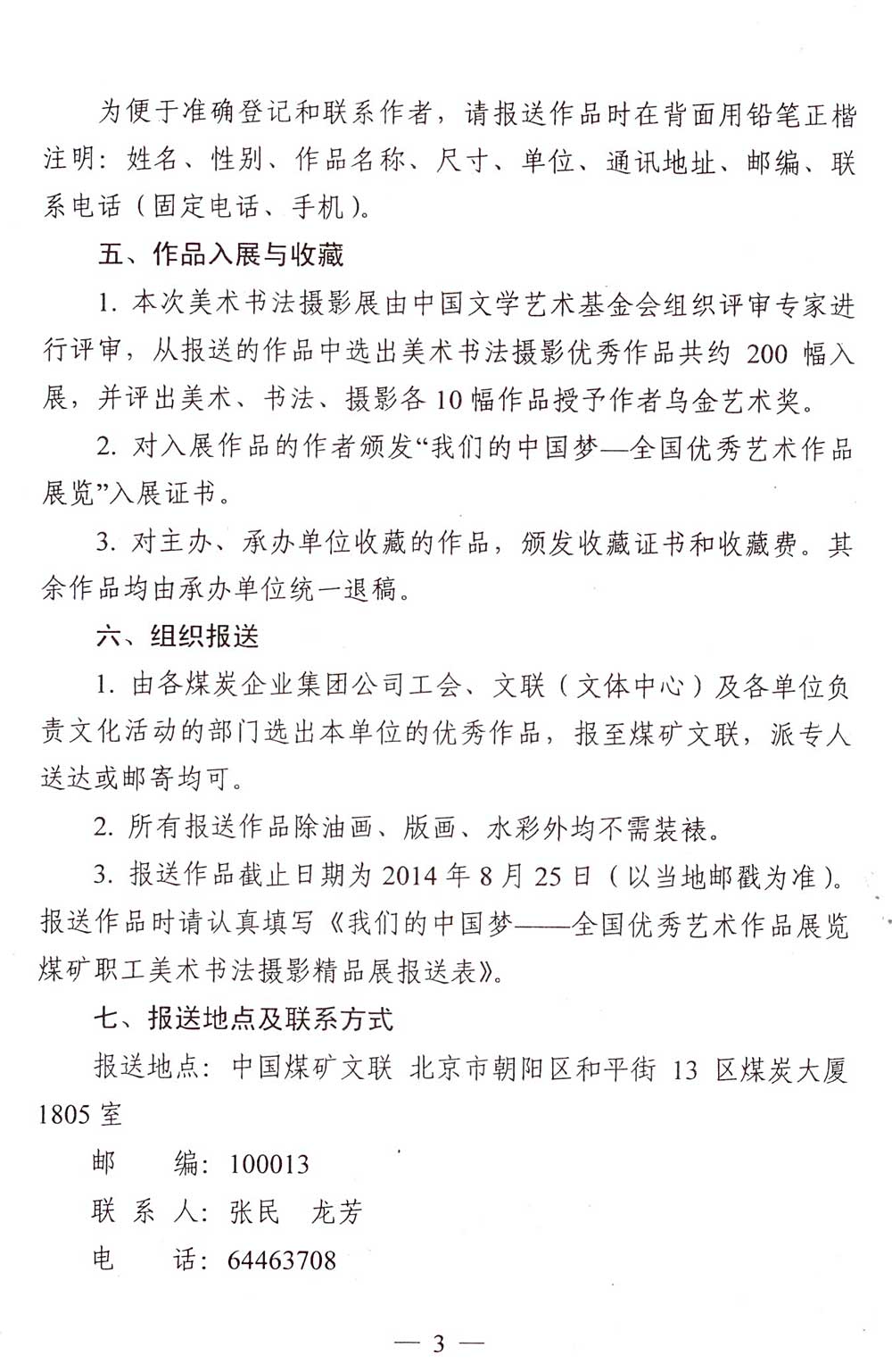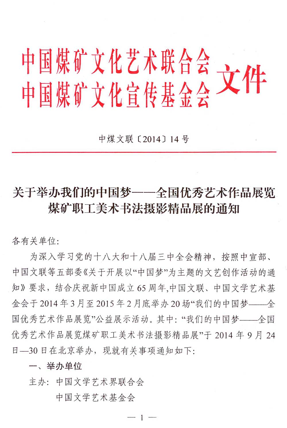 关于举办我们的中国梦——全国优秀艺术作品展览煤矿职工美术书法摄影精品展的通知 来源:中国煤矿文联 作者: 时间:2014-07-15 【字体:小 大】 附:我们的中国梦全国优秀艺术作品展览煤矿职工美术书法摄影精品展报送表 分享到: 【打印正文】