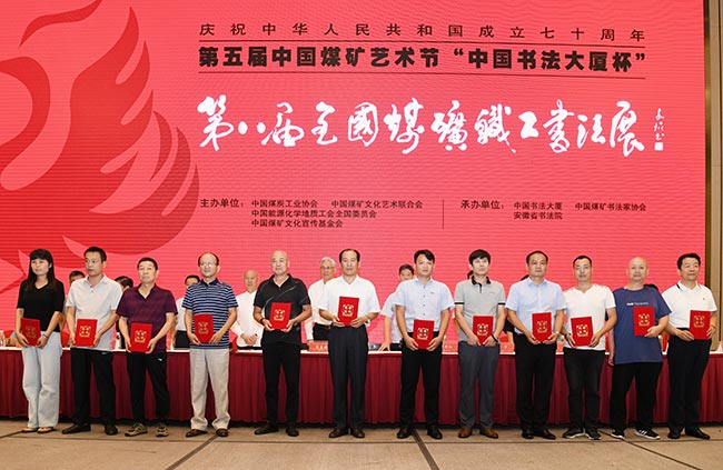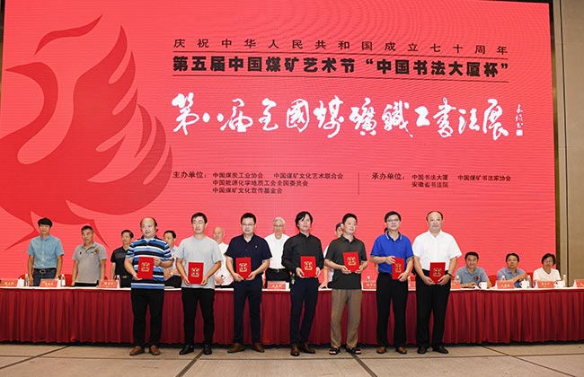 8月23日,由中国煤炭工业协会、中国煤矿文化艺术联合会、中国能源化学地质工会全国委员会、中国煤矿文化宣传基金会联合主办,中国书法大厦承办的“庆祝新中国成立七十周年”第五届中国煤矿艺术节“中国书法大厦杯”第八届全国煤矿职工书法展览在安徽省合肥市隆重开幕。中国文联全国委员会委员、中国煤炭工业协会党委书记梁嘉琨,中国煤矿文联副主席张强,中国书法大厦艺委会负责人、安徽省书法院院长李士杰,中国煤矿书协主席张宇,中国煤矿书协主席团成员、有关煤炭企事业单位文艺工作负责人和部分书法展览作者等500多人参加开幕式。
