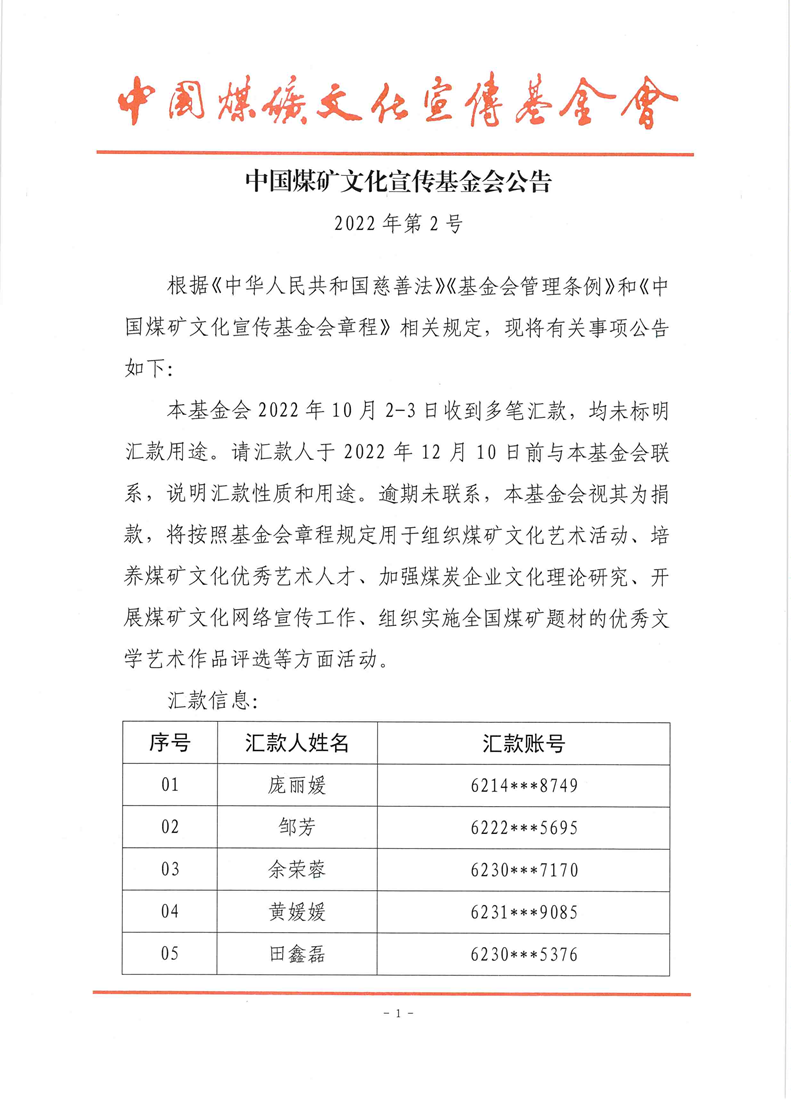 中国煤矿文化宣传基金会公告 2022年第2号