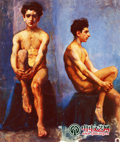 源自古埃及着色玻璃的清末玻璃画——也就是画在玻璃上的油彩画,岁月已逝,但画中美人依旧惟妙惟肖、恍如昨日,这门现已失传的创作技法对20世纪初精致美女画风的月份牌广告画影响深远。上世纪初,李叔同留学日本时创作了一幅《半裸女像》,画中一位安静、媚美的裸体少女浴后舒适地躺着。叶圣陶曾说:“中国人对人体模特写生,大概李叔同最早。”这幅画又是李叔同人体写生创作中的早期作品,很是值得品味。而徐悲鸿赴法留学期间创作的《男人体正侧面速写》《男人体》则是从正面、侧面两个不同角度对同一个模特进行的速写与油画写生习作,速写与油画之间紧密联系显而易见,男人体造型严谨、结构精准,油画用色冷暖对比,恰如其分地反映了徐悲鸿在法国所受的古典主义油画教育以及其本人所推崇和力行的以“素描为基础的西洋画教育”的教学主张。常书鸿处在风格渐变时期创作的《女坐裸体像》则将裸女人体与中国式背景相结合,画面光线柔和,颜色趋于调和,背景和道具采用中国传统的花纹样式,表现出他在欧洲古典主义学院风格的基础上,对“中国油画体式”的探索。