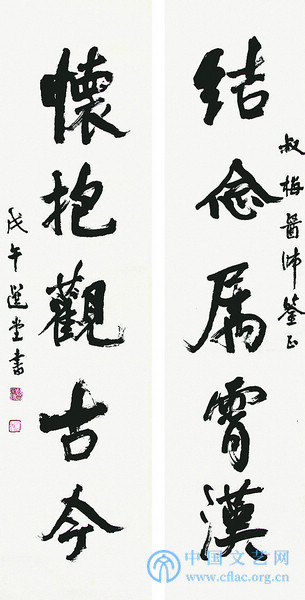 进入晚年,他对敦煌书法长期专攻,选取巴黎所藏敦煌经卷精萃编为《敦煌书法丛刊》29册,化所有学术和书法养料而成就自我书法风格,终于形成不同于各家各派的古文字书法风格。我们知道,当代中国书法界的现状是多种潮流的多元并存,但又各自为政。一些书家反经典书法,乐于从那些名不见经传的民间书法和新发掘出的瓦当、墓志中去寻找——运用碑学、简牍学、敦煌写经、民间墓志等很多东西融入个人的书法创作。而西化的现代后现代书法,一些人将绘画墨象和书法整合起来,使书法更像抽象绘画。但我相信,真正具有坚实思想的书法家,理当告别捷径而走艰难的书法正“道”,即在新时代发扬汉字书法的一切新的可能性!丧失了“汉字”和“线条”这两个基本点,丧失了文化继承和创新这个底线的话,未来的“用毛笔蘸墨的纸上运动”,我不知道该怎么命名之。