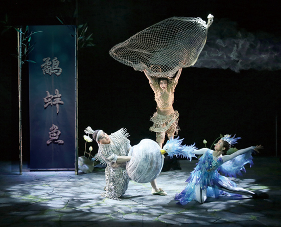 《鹬·蚌·鱼》取材于“鹬蚌相争,渔翁得利”。剧中增加了鱼和渔妻两个“人物”,以复式结构:先创作出“鹬蚌相争,渔翁得利”的有趣又有逻辑的戏剧过程,再推进到“渔翁夫妇相争”的反向戏剧发展,落点放在了对“和谐相处”的形象化呼唤上。这个作品的创作初衷,是中国儿艺面对低幼观众和国际交流作品的短缺,想以没有语言的方式,强化更加形象的视听手段,让小小观众和不懂汉语的外国观众接受无障碍。灵感是在音乐的想象中萌芽的:中国民乐打击乐中的变化多端,可以表现不同节奏、情境的争斗;富有个性的民族乐器如琵琶、唢呐,可以鲜明表现鹬鸟、渔夫这些不同的形象和情绪。这个成语本身是讲争斗会带来两败俱伤,实际就是呼唤和平共处。中国优秀传统文化能流传至今,其中蕴含的价值观是相对永恒的。现在全世界都在呼唤和谐,消除纷争,有这个主题作支撑,任何国家的大小观众都会对它认同的。