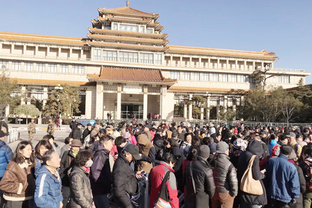 2017年11月17日至26日,由中国美术馆策划并主办的“美在新时代——庆祝‘十九大’胜利召开中国美术馆典藏精品特展”在中国美术馆面向公众开放。展览迅速获得观众叫好,超出日常参观量的5倍之多,排队观展的队伍绵延长达2公里,与11月北京凛冽的寒冬相比,场面可谓异常火爆。