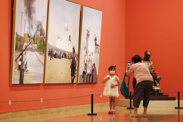 一位小观众在“伟大征程 时代画卷——庆祝中国共产党成立100周年美术作品展”展览现场留影