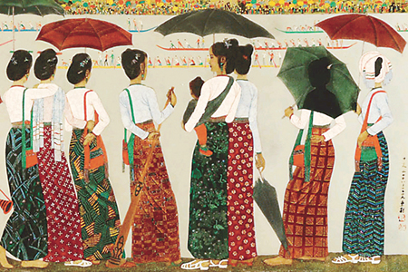 1978年,乔十光自云南、四川等地写生之后,创作了《泼水节》《爱尼姑娘捻线舞》《象脚鼓声》《青藏高原》等漆画作品,这些来自于真实生活感受的作品,以“装饰化”造型语言为风格基调,在“线”的“起承转合”与“面”的“绵延起伏”中形成了一种韵律之美,生动表现了川滇地区浓郁的民族风情。1987年在中国美术馆举办的“乔十光漆画展”被认为是“漆画作为一门独立画种被确认的关键事件”。此次展出的作品,充分发挥了大漆媒材黑、光、润、融的特点,具有幽邃的纹理意象、鲜明的色彩对比和优美的韵律感。我们可以发现,吴冠中的水墨艺术具有简淡秀丽之美,丁绍光的重彩艺术具有莹透淡雅之美,而乔十光“计黑为白”的漆画艺术则具有一种沉静俊逸之美。乔十光通过这次个人画展所呈现的大漆艺术的强大表现力,深深影响了一批年轻艺术家投入漆画艺术创作,推动形成了一个新兴的画种。
