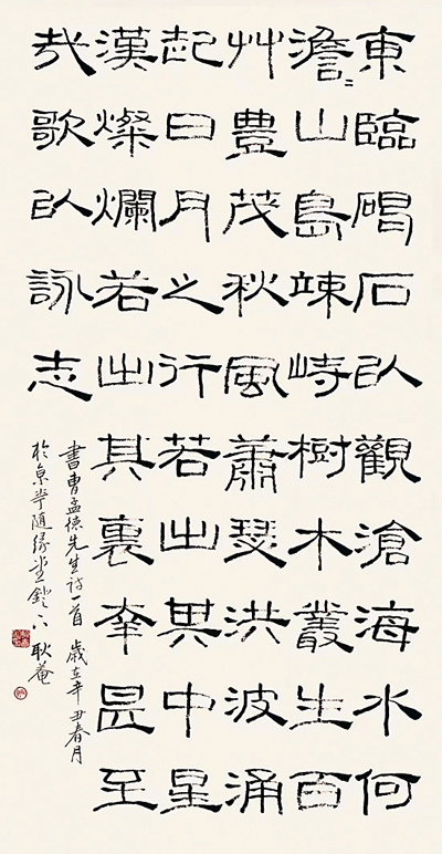 书法的继承与创新已是老生常谈,但如何创新,羿耿庵一直都在深思和探研。他始终认为,学书必须在深入学习古人传统经典之后,再注重追求艺术的创新。他常常告诫自己,师古不能泥古,不然终是奴书。他60岁后自刻“六十我法”一印,从中表明了自己“求变出新”的艺术主张,也寄托了他锐意求变、立意创变的心路。他说:“学古人要变古人是十分迫切而首要的,只有背叛老师才能生,搞艺术要敢于求变、善于求变,如人天天变老,字不变不行。书法是有渊源的,不同时代的书法面貌有不同的变化,从殷商到两周,两周到秦汉、再到唐宋,书风、书体是逐步变化的,这说明变化具有时代性,故意人为的变化是不行的,学古人不是目的,最终要能学古人而能变古人,逐步创立自家风格。 ”羿耿庵近作草隶作品《林散之先生诗》从汉简帛书中汲取养料,既具深厚的传统书法功力,又有丰富的笔墨神韵,在继承传统汉隶的基础上多有创新,该作品将篆书中最讲究的结体、草书中最传神的笔墨情趣有机地融入到隶书中去,又把简帛书的自然天真之趣与碑刻隶书的浑厚古朴之气有机地结合起来,形成了独特的个人风格。