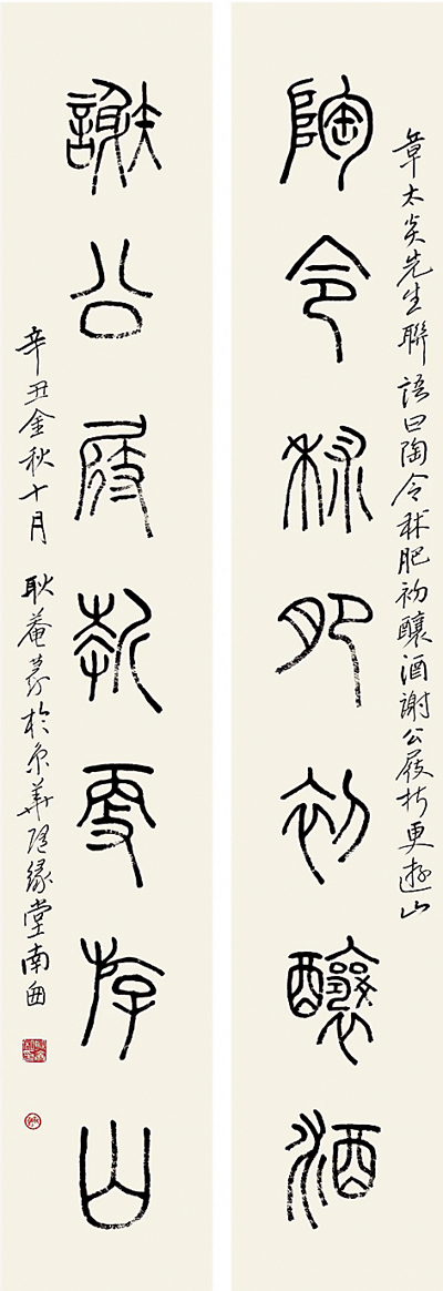 羿耿庵的篆书从秦篆入,并上探两周金文、殷商甲骨文,早年曾对秦篆名迹《泰山刻石》《峄山刻石》等下过较深的功夫。23岁时他以铁线篆笔法所临的《泰山刻石》手卷,便受到其恩师沙曼翁先生的赞誉并亲笔题引首“秦篆正宗”。近年羿耿庵尤对《石鼓文》研究颇多,用功甚勤,并用《石鼓文》笔意融入小篆,使所书小篆更显古朴浑厚,其篆书作品《章太炎先生联语》用笔参以古金文之厚重,结体往直中求、减少盘曲,“不向曲中寻”,由此笔势更加遒劲,用笔用墨极富神韵。