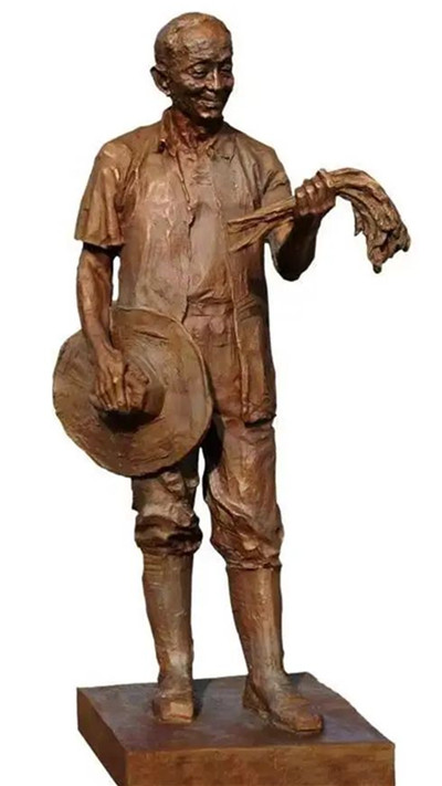 种业是粮食之基。只有实现种业科技自立自强、种源自主可控,把种子牢牢攥在自己手里,才能长久地保障粮食安全。吴为山创作的雕塑《袁隆平》,生动传神地再现了农业科学家袁隆平朴实乐观、勤奋钻研的形象——右手拿着草帽,脚上的高筒靴沾着泥土,表示他刚刚走出稻田;双目注视左手紧紧攥着的一束稻穗,嘴角上扬,露出欣慰的笑容,寓意其农业研究取得进展。作品寄托着人们对“杂交水稻之父”永远的敬意。