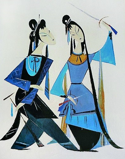 林风眠在研究中国传统艺术的同时,也长期关注着西方现代艺术。在创作实践中,他试图提炼东西方艺术的语言要素,寻找两者的共通之处,并进行融合。热爱戏曲的他,一生中创作了大量浓墨重彩的戏曲人物,其中多幅作品的构图和人物形象较为相似。画家以平面化的造型语言描绘人物和服饰,力求概括对象,强调线条的流畅和表现力,但每幅作品又在线条走向、形体结构、造型特征等要素的处理方式上各有侧重,呈现出微妙的差异。对比他以中国画和油画两种艺术语言创作的《白蛇传》便可见一斑。