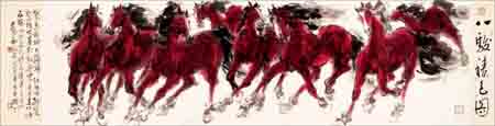 他的这种专属技法的实践,固然是其精湛技法的呈现,更是其自觉从古典文化情结和语言根脉中升华而来的神圣意识和情怀源泉。他以大写意笔墨技法呈现出来的昂扬而饱含诗意的汗血宝马新姿态和盛世气势,是他对历史的仰慕与思索,亦是他对时代的赞歌。正是这种对马绘画题材所蕴藏的精神内涵的升华,汗血宝马的激情生命力和典型特征就成为他展现浓郁家国意识的载体,承载着他积极入世的审美态度和肩负历史责任的审美期待。个人的艺术追求、汗血宝马的理想化形象与家国、时代的塑像结合,让他在充满意象的造型中,对汗血宝马的文化属性和家国属性作出更加立体的思考,对汗血宝马的审美期待作出了新的定义。他在《汗血宝马绘画教程》中,整理出一套关于汗血宝马画法的理论体系,详尽细致而又创造性地将汗血宝马绘画的艺术形态与理论工具书合而为一,将其诗、书、画三位一体的绘画理论与表现形式阐述得生动形象,为描绘汗血宝马的理想形象提供了另一种审美标准,具有积极意义。