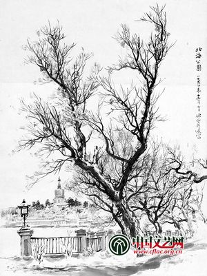 在深圳市关山月美术馆推出的“南北风采——关山月北京写生专题展”中,关山月1954年北京写生作品《北海公园之一》与现在北海公园实景照片对比展出