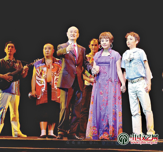 现代京剧《生活秀》中,刘子微(右二)与关栋天(左三)联袂出演