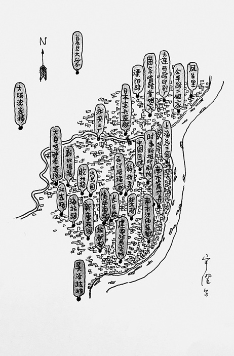 《回望》中有一张金宇澄自绘的地图,标出父亲母亲于1965年之前居住过的地点,竟有近三十处,包含上海的“上只角”、“下只角”,纵贯南北,遍布市郊。