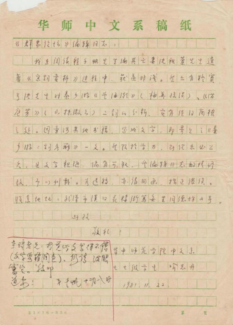 1981年12月7日下午,《江海学刊》的两位编辑许总、曹朋来到南京大学教授程千帆家,将一篇商榷文章放到他的案头,同时还出示了文章作者写给杂志社的信。文章针对的是由他整理的沈祖棻遗著《宋词赏析》,其中关于秦少游两首词的分析,这位作者——华中师范学院中文系七七级学生喻志丹——有不同看法。《群众论坛(丛)》编辑同志(按:《江海学刊》在1980年曾更名《群众论丛》,1982年恢复):