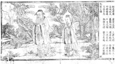 两本有部分图版如《先圣小像》《退而删定诗书》全同,但也有部分图版存在较大差异,如“先圣未生时有麒麟吐玉书”一图,“中贸本”左半部分画面繁复,“国图本”将回廊、花木,地面的草丛全部略去;“先圣诞生之夕,有二龙绕室,五老降庭”一图,画面上弥漫的云气,殿阁旁葱郁的林木全然不见;“孔子学琴于师襄”一图,人物形象、服饰、站位、动态、表情基本相同,但布景几乎全被省略,松树的画法也大不相同,类似的情况还有很多,兹不一一列举。大致是“国图本”仅保留了“中贸本”(沈藩本)的主要故事情节,作为场景烘托的细密、繁复的背景描绘则多被略去。至于线刻的运用,“中贸本”柔韧、细密、生动,“国图本”粗糙稚拙,更有云泥之别。