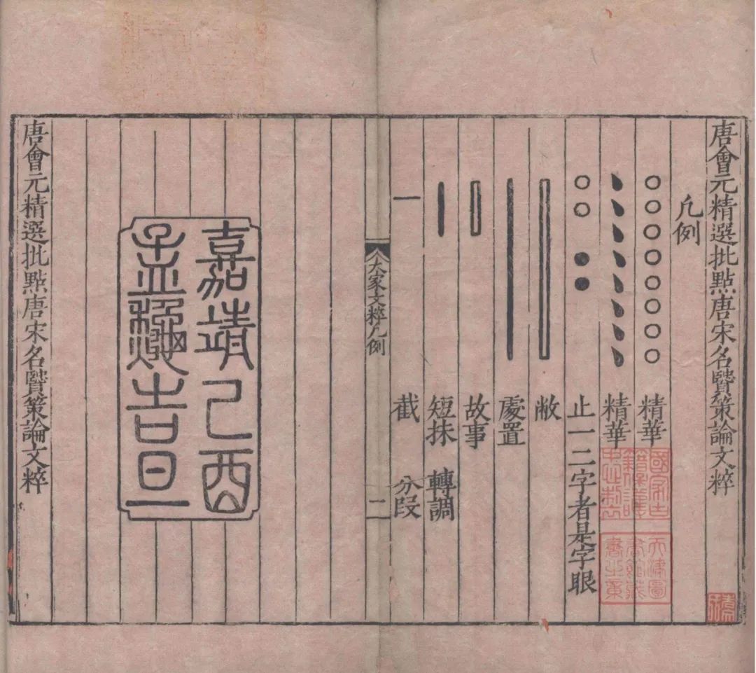 为引导购阅行为,中晚明的书商往往会将圈点作为一种书籍质量的标志,在题名或卷首凡例等显著位置强调。特别是名家批点,更能起到吸引读书士子购阅的作用。如前引《唐会元精选批点唐宋名贤策论文粹》一书,扉页牌记特别指出该书批点出自唐荆川之手: