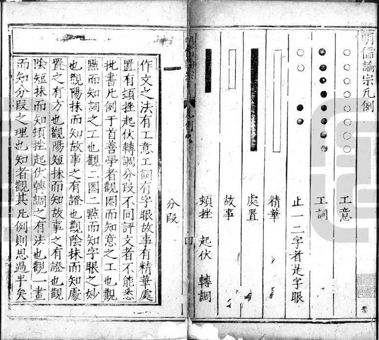 作文之法,有工意、工词,有字眼、故事,有精华、处置,有顿挫、起伏、转调、分段不同。评文者不能悉批,书凡例于首。善学者,观圈而知意之工也,观点而知词之工也,观二圈二点而知字眼之妙也,观阳抹而知故事之有证也,观阴抹而知处置之有方也,观阳短抹而知故事之有证也,观阴短抹而知顿挫、起伏、转调之有法也,观一画而知分段之理也。知者观其凡例,则思过半矣。29