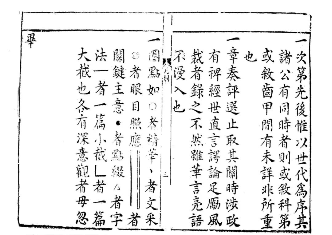 一是以圈点符号来标示选文的评价等级。例如晚明的举业用书《新镌选释历科程墨二三场艺府群玉》,由衢州书坊翁日新刻印。此书署焦竑、王衡同选,唐汝澜注,邵名世、王时学同校,翁日新绣梓。焦竑、王衡之名当系伪托,实际的编选、注释工作应由唐汝澜承担。唐汝澜对所选科考二三场中论、表、判、策程墨的等级评选,皆以圈点作为标示。对此,书前《新镌选释历科程墨二三场群玉圈点凡例》有清晰的说明: