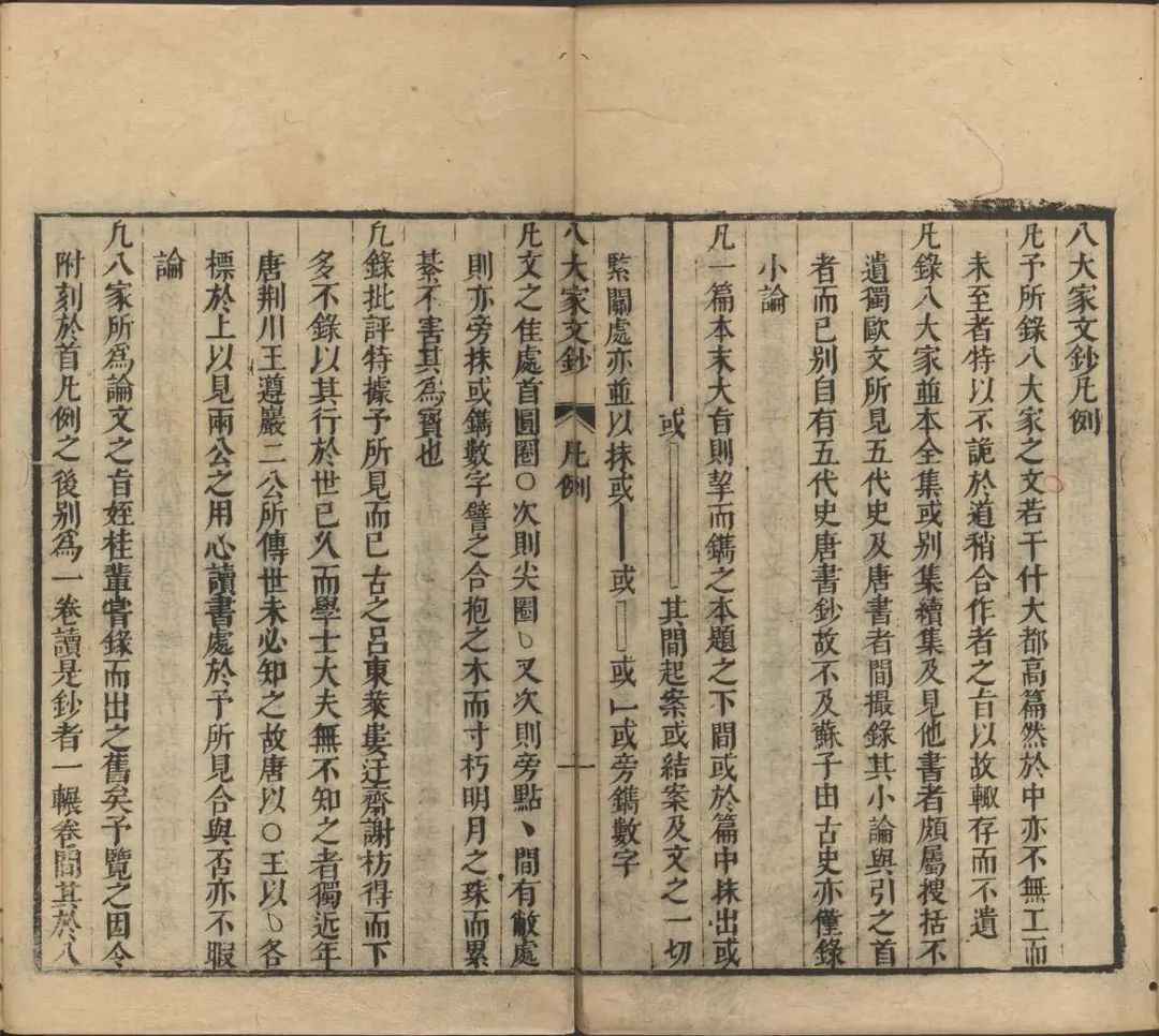 此段圈点凡例与《文体明辨》所载《大明唐顺之批点法》大体一致。唐顺之的圈点法基本沿用南宋“古法”,即如《文章正宗》所示的圈、点、抹、截四种符号。不同的是,其中另有以虚长抹标示的文之敝处、虚短抹标示的用典处。特别是前者,尽管在唐顺之所编的文章评点诸书中用例并不多见,但至少可知明人读书,对古人文字佳、恶两方面皆有关注。《唐宋八大家文钞》在吸收唐顺之圈点法时,对此亦有说明:“凡文之佳处,首圆圈○,次则尖圈△,又次则旁点、 。间有敝处,则亦旁抹,或镌数字,譬之合抱之木而寸朽,明月之珠而累綦,不害其为宝也。”16通过圈点标示文字敝处,以警示读者,这是评点之学在明代出现的新变。
