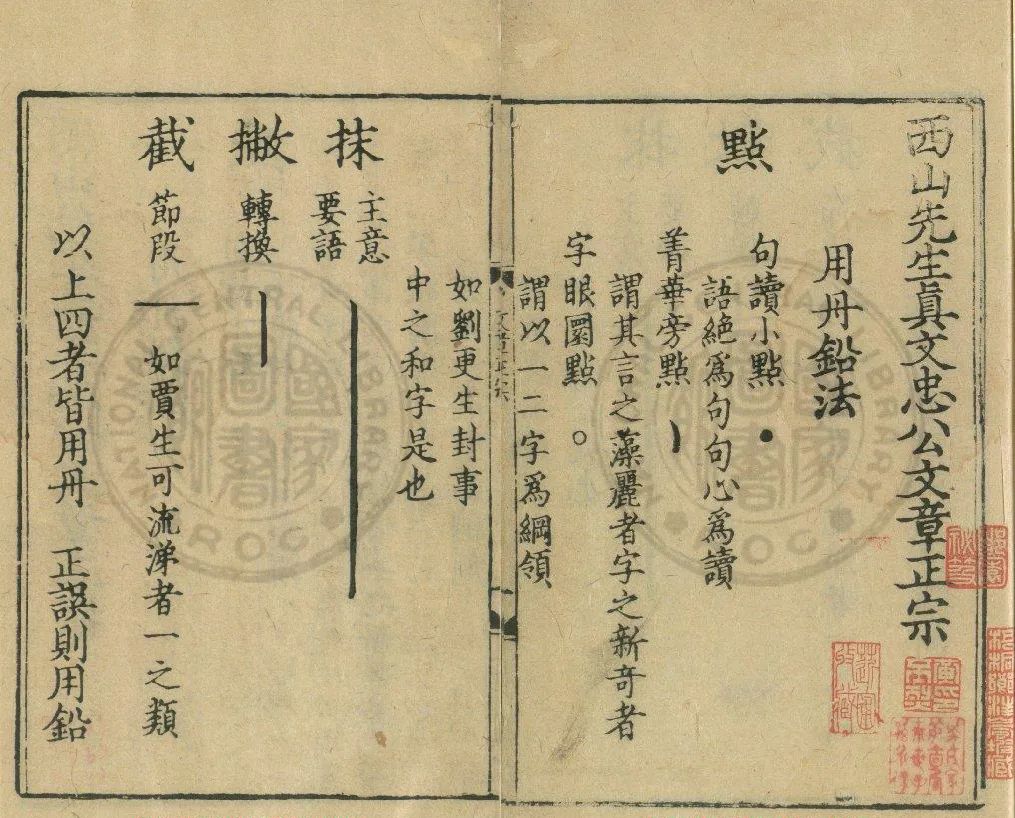 除标示句读的“小点”外,其余“旁点”“圆点”“抹”“撇”等符号,分别标示佳句、字眼、立意及行文结构,皆可视为指示文法之标记。如果结合南宋时期编刻的诸多文章总集,便可看出《文章正宗》所标示的圈点法具有一定的代表性:在形式上基本以圈、点、抹(撇为短抹)、截四种符号为主,在符号的含义上多指向字句章法、行文立意的作文法。