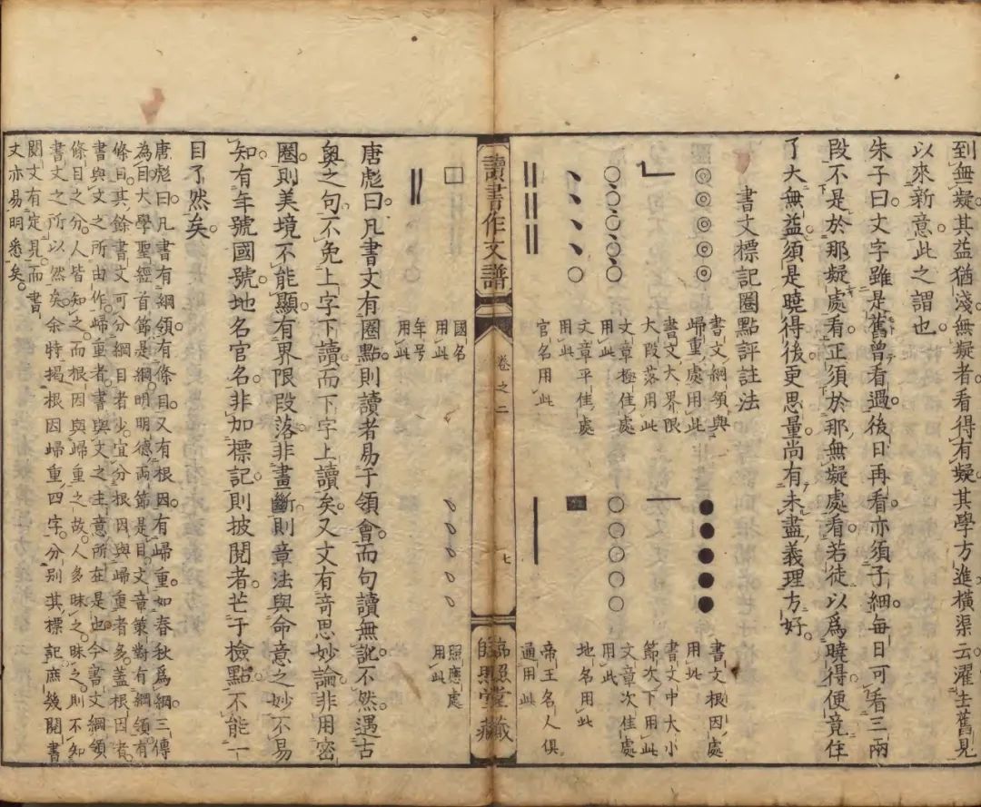 除了对声音的关注,清人的阅读理论对圈点运用也作了更深入的分析,出现了如清初唐彪《读书作文谱》一类细致论述读书法的专书。该书列有《书文标记圈点评注法》,指出“凡书文有圈点,则读者易于领会,而句读无讹”43,将圈点之法融入到阅读理论之中,既便于读者断句识文,也有助于领会文章精华和写作技法。分析晚明至清初文论家有关书籍阅读的相关论述,有助于我们从文字以外的符号、声音等视角去考察古代的读书及作文法。