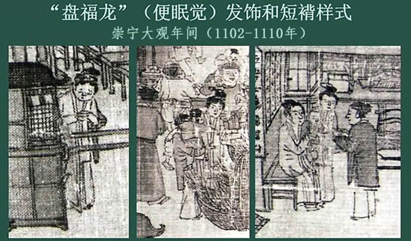 北宋妇女普遍穿长裙,裙子能把脚面盖住。但在北宋崇宁至大观年间,流行短褙样式,还有“盘福龙”发型。这个短褙就是短款的服装,据余辉介绍,这样式是从女乐伎中流行开来,最后在市民百姓间普及,穿着方便、干活行动也方便。从《梦华录》中看出女子可经商。此时商业繁荣,妇女在家干活,还能在外做生意,短褙服装在市井街坊中比较常见。