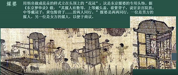 在《清明上河图》为数不多的女性形象中,有女性头戴花冠。这是当时特殊的女性职业——媒婆。在当时汴京开封,媒婆根据服务对象的不同阶层而划分等级。她们一般两两出行,一个掌握男方信息,一个则掌握女方信息。