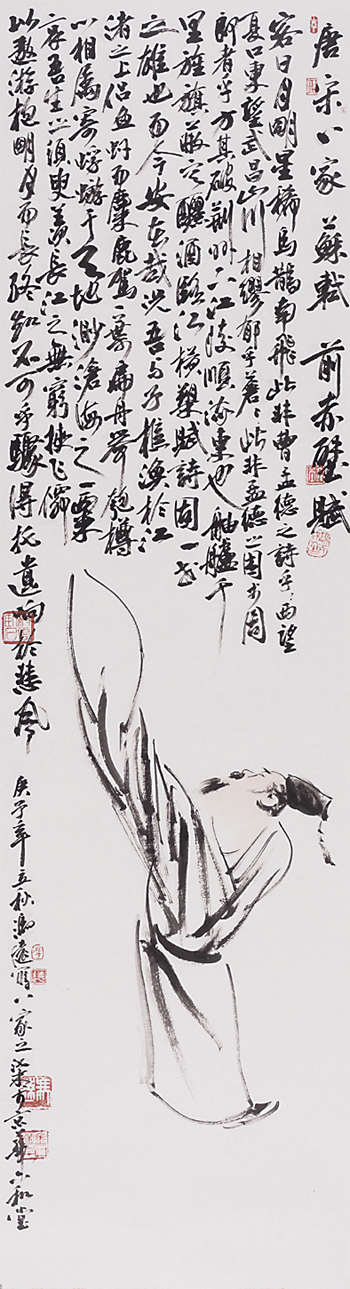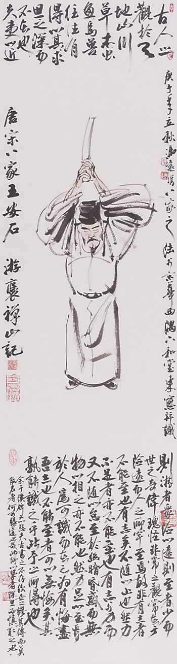 冯远的人物画“唐宋八大家”系列,比之“先秦诸子”系列,笔墨更为开张、简练,凸显出文人放达的性情和复杂的性格。韩愈、柳宗元、苏氏三父子、欧阳修、曾巩等人,文章盖世,事功惊人,复合型的身份让他们在政治与文章中游走,人格饱满又深刻。“唐宋八大家”系列的书法长跋让人耳目一新。当代国画的书法缺失,早已引起有识之士的忧虑。没有毛笔字题款的国画作品,会降低当代国画创作的品质。因此,要求当代国画家提高书法水平的呼声越来越高。冯远注重书法的研习,注意书法对画作的促进与提升。1977年他在浙江美术学院攻读研究生,三年的系统学习,让他认识了神秘而博大的传统艺术世界。浙江美术学院(今中国美术学院)重视书法,是最早设置书法专业的美术学院,当然要求美术学院学生也要学习书法。冯远在青少年时代染指丹青,也弄翰墨,进入大学,勤于临帖,铸就了自己的笔墨功夫。他的画作,书法占比较大,“唐宋八大家”系列就是证明。他大幅度题跋,有的是抄录所绘人物的诗文,有的是书写个人的感受、感想,以不同的文辞,不同的书体,强化画作的文化含量。书法对国画有文辞和笔墨的双重推进,前者是主题深化,后者是艺术手段,这一点,牛克诚一语中的:“冯远的人物画,通过让坚实的造型功底与书法式的抒情笔墨结合,让现实主义的创作题材与厚重博大的精神传统相联结,建立起具有鲜明时代感的语言形式。”