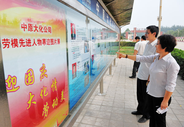 河南能源中原大化公司举办“迎国庆 大化情 劳动美”劳模先进人物事迹图片展 来源:河南能源中原大化公司 作者:吕标伦 时间:2015-09-28 【字体:小 大】 国庆前夕,河南能源化工集团中原大化公司组织了以“迎国庆、大化情、劳动美”为主题的劳模先进人物事迹图片展。旨在通过展览激励广大职工以劳模为榜样,钻研技术、爱岗敬业,为企业健康发展多作贡献。图为9月28日,几名职工在宣传橱窗前驻足观看图片展。 智能标签: 河南能源 中原大化 相关内容 分享到: 【打印正文】
