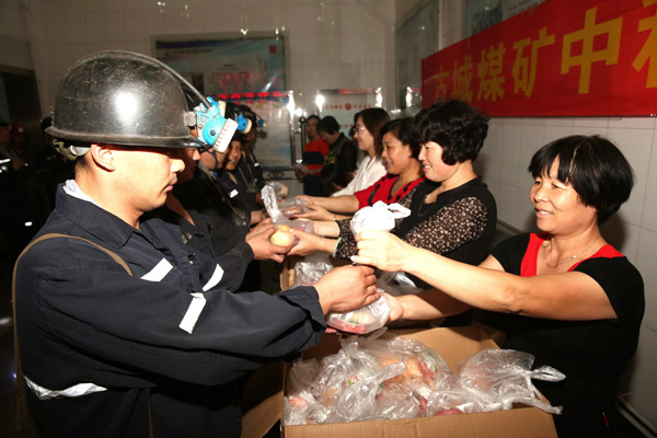 一个苹果平安心,两个月饼妻儿情,一声祝福盼平安。女工家属们把装有月饼、苹果和火腿的中秋礼包塞到即将入井的职工手中,嘘寒问暖,不断地叮嘱他们要把家人的牵挂和安全生产时刻牢记心中,高高兴兴上班,平平安安回家。浓浓的亲情,表达了大家对矿工亲人的美好祝愿。