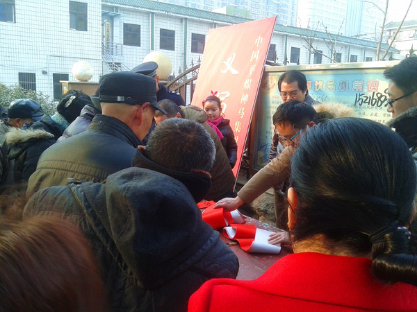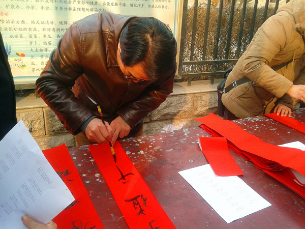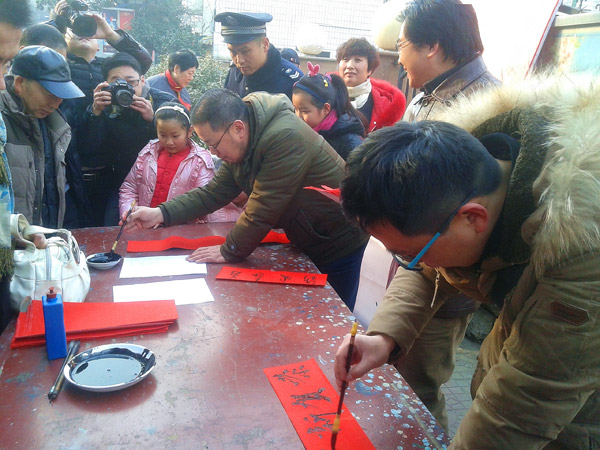 春节前为职工家属义写春联这一活动,已经连续进行了17年了,业已形成了一个传统,很受人们的欢迎。由于《平顶山晚报》事先做了信息发布,所以已经有不少人在义写点等候,书法家们把书案一摆,便被围得水泄不通。在义写的两个小时里,书法家们共书写送出春联350多对,虽说个个都是满头大汗,可能为大家送上一份新春祝福,看到人们拿到春联后喜悦的神情,都说从心里得到了一份满足。