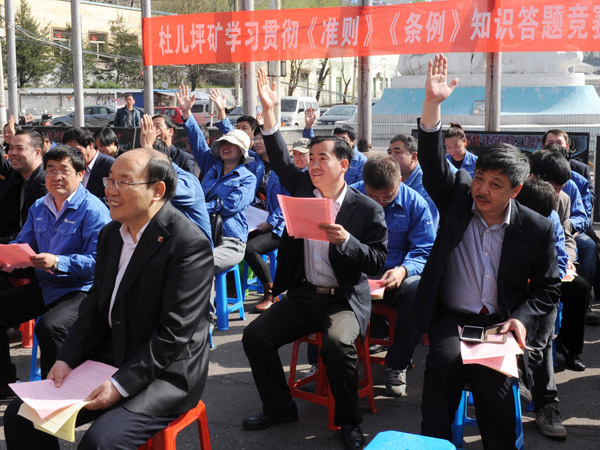 山西焦煤西山煤电集团杜儿坪矿开展廉政主题宣传活动 来源:山西焦煤西山煤电集团杜儿坪矿 作者:谢夏雨 时间:2016-04-14 【字体:小 大】 4月14日,山西焦煤西山煤电集团杜儿坪矿举办“开展‘两学一做’建设廉洁焦煤”主题宣传活动。当日,举行了集体诵读《中国共产党廉洁自律准则》、廉洁从业签名、参观警示教育案例牌板展黑板报展等活动。图为参加活动人员在学习贯彻《准则》《条例》知识竞赛中踊跃答题。 智能标签: 山西焦煤 西山煤电集团 杜儿坪矿 相关内容 分享到: 【打印正文】