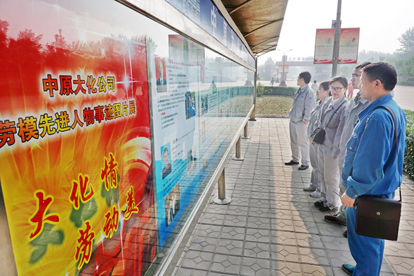 河南能源集团中原大化公司举办劳模先进人物事迹图片展 来源:河南能源集团中原大化公司 作者:吕标伦 时间:2016-05-01 【字体:小 大】 为大力弘扬劳模精神,集中展现企业各级劳模先进人物的光荣事迹,“五一”前夕,河南能源中原大化公司举办了以“弘扬劳模精神,争做时代楷模”为主题的“大化情·劳动美”劳模先进人物事迹图片展。图为4月29日,刚下夜班的中原大化职工在宣传橱窗前驻足观看劳模先进人物事迹图片展。 智能标签: 河南能源集团 中原大化公司 相关内容 分享到: 【打印正文】