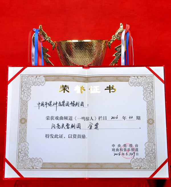 前期的准备工作顺理成章,水到渠成。转眼,晋京参赛的日期一步步逼近。2016年3月25日,是不平凡的一天。参赛人员整装待命,接受领导的送行后,踏上了北上的行程。43位晋京参赛人员,承载着集团四五万职工的寄托和希望,信心满满,斗志昂扬。此时此刻,激动的心情冲淡了一切,央视的大舞台就在脚下。此次晋京参赛演出比赛,规格高,要求严,现场打分,实行优胜劣汰,胜者上,败者下。由于我们有充分的准备和自信的心态,进入央视后,每位参赛人员的言行举止,活动动态,显得格外有礼有节,在家和谐团结,出门更显团队精神。首场演出,我们发挥出整体最佳水平,但出人意料的是,我们的现场打分最低。我们百思不得其解,了解情况后才知道,《刘墉铡西宫》唱的是河南豫东调,京城戏迷不买账,同样是豫剧,但受地域的影响,头一仗给我们当头一棒。按比赛规定,下一场如果分值总和最低的话,我们就要卷旗收兵,打道回府。鉴于此情此景,对下一场比赛我们更不敢掉以轻心,要做到细发如丝,严不透风才行。所有参赛人员都在不言中调整好状态和心态,第二场的比赛拿下了全场最高分,用实力和水平让观众折服,保留了我们的参赛权,继续留在央视的舞台上。定下乾坤后,缓解了同志们的紧张心情,也稍稍松了一口气。随后的四场比赛一鼓作气,场场精彩,不仅倾倒了京城的观众戏迷,也打动了现场的专家评委,最终,我们用自己的实力和高超的演出水平,摘取金奖,实至名归。中国平煤神马集团豫剧团能够登上央视的大舞台,并一举夺得金奖,开企业文化历史先河,证实了中国平煤神马集团豫剧团艺术的沉淀和厚积薄发的实力再现。赛事结束了,金奖拿到了。中国平煤神马集团豫剧团没有辜负集团领导和十二矿领导的委托和期望,没有辜负身后四五万职工的支持和期待。我们要的是“不鸣则罢,一鸣惊人”的矿工风采,我们要的是集团企业文化的品牌,正像银奖获得者发自内心的感言,中国平煤神马集团豫剧团当之无愧,荣获金奖我们服气。激动的心情在慢慢平静,喜悦的泪水在止不住流淌。为了这次的比赛,全体演职员工都在默默作出自己的贡献,都在为登上央视大舞台牺牲着自己的一切,这就是团队精神,这就是我们获胜的法宝。