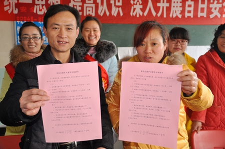 12月16日,淮北矿业集团朱仙庄矿职工王吉伍与妻子马春梅展示签订的《夫妻安全承诺书》。《承诺书》中丈夫承诺:严格遵章守纪,按章操作,远离“三违”。妻子承诺:照顾好家庭,不让丈夫带着情绪上班,保证丈夫上班前禁止饮酒,并长吹枕边安全风。为确保岁末年初矿井安全生产,该矿组织部分职工与妻子签订《夫妻安全承诺书》,将安全防线前移至家庭,努力形成家庭与企业、丈夫与妻子合力保安全的良好局面。