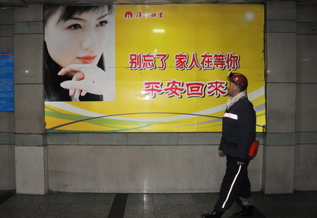 12月16日,淮北矿业集团朱仙庄矿一名职工正通过写有“别忘了家人等你平安回来”的安全宣传画旁。该矿在井口、更衣室、走廊等处张贴亲情味十足的安全祝福、安全问候宣传画,让职工在入井前再次回味亲人的嘱托,从而提高职工安全意识。这些安全祝福和安全问候语调和蔼温馨,也被职工亲切地称为安全“暖语”。