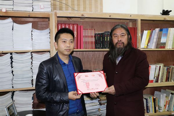 柳雄贵(右)在贵州省习水县土城四渡赤水纪念馆接受捐赠证书